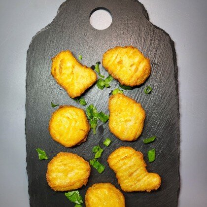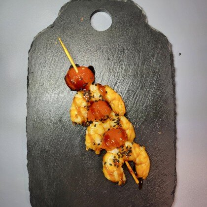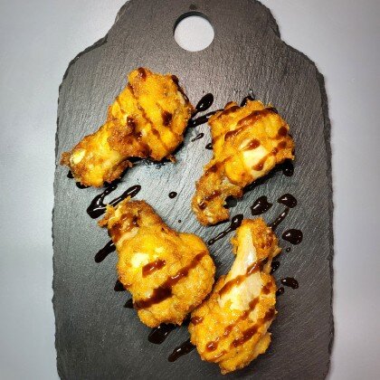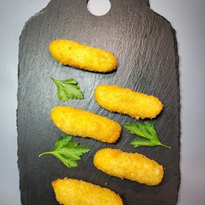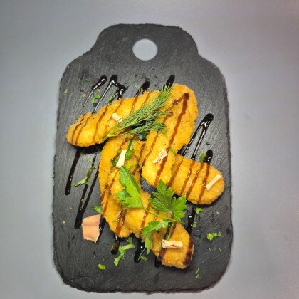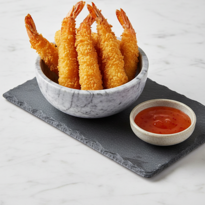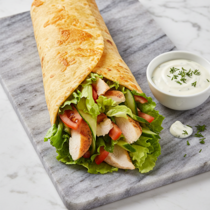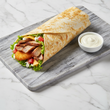 Сырная лепёшка, Тигровая креветка в хрустящем кляре, фирменный соус, помидор, маринованный огурец, салат айсберг, ломтик плавленого сыра.