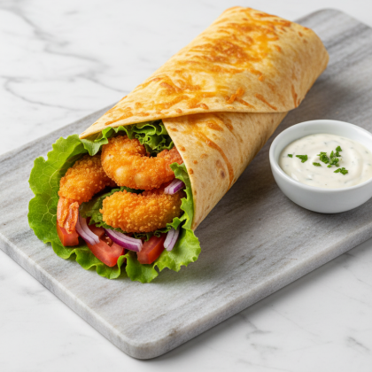 Сырная лепёшка, свинина в хрустящем кляре, фирменный соус, помидор, маринованный огурец, салат айсберг, ломтик плавленого сыра.