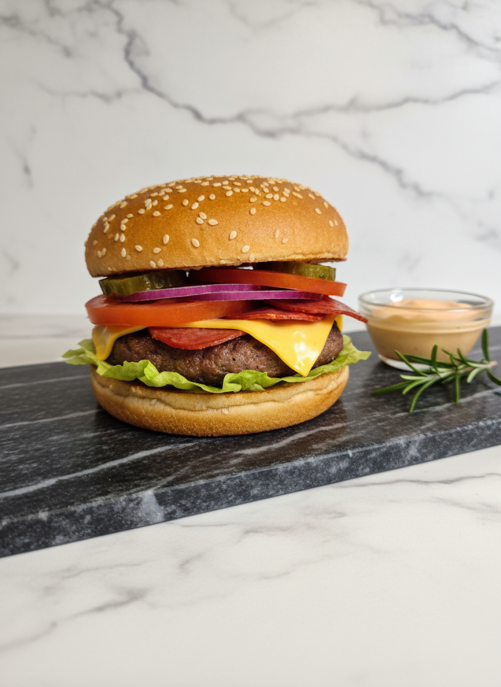 Булочка, фирменный соус, помидор, котлета говяжья, пепперони, сыр моцарелла, салат.