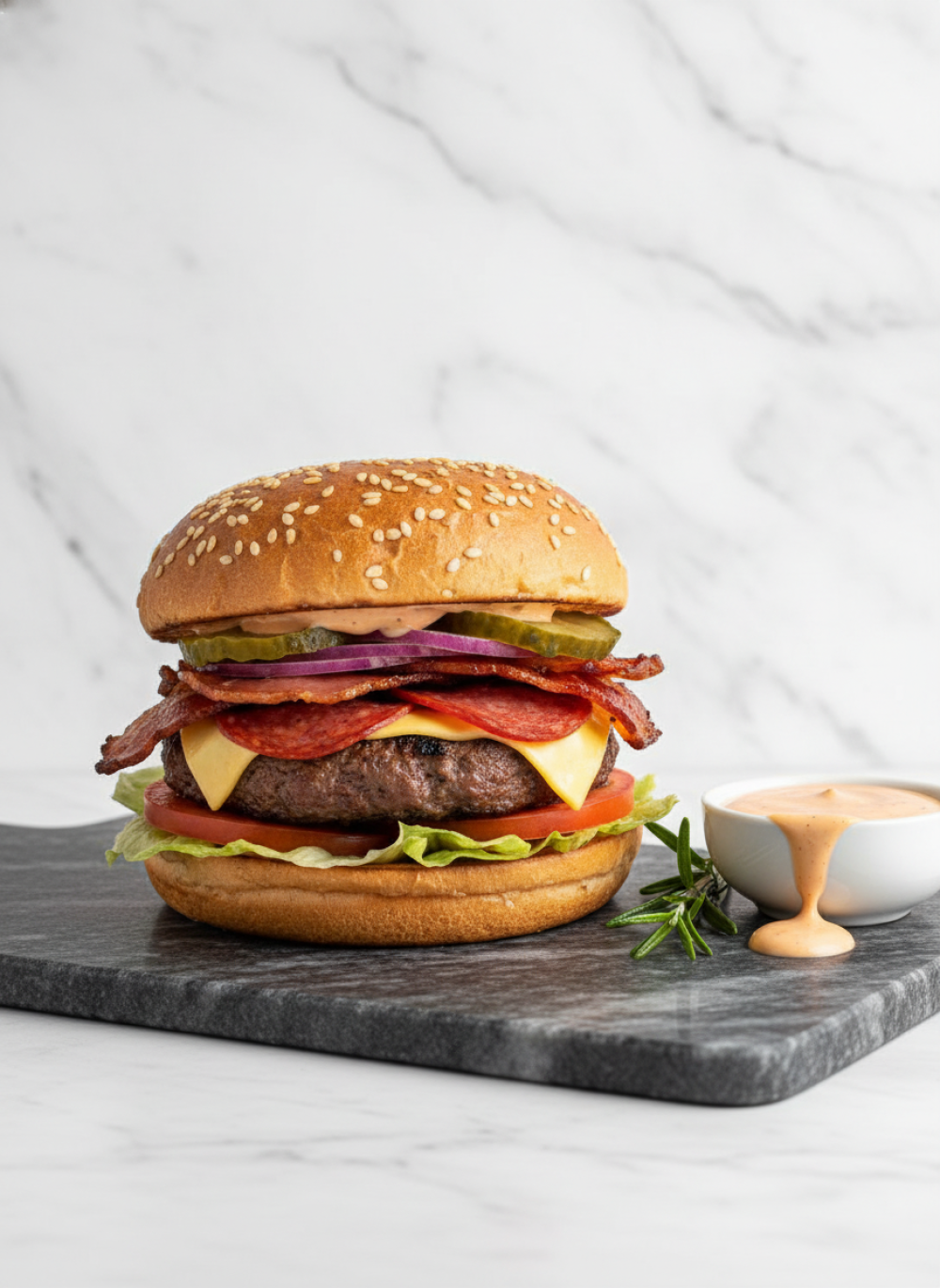 Булочка, фирменный соус, маринованный огурец, бекон, пепперони, котлета говяжья, сыр моцарелла, салат