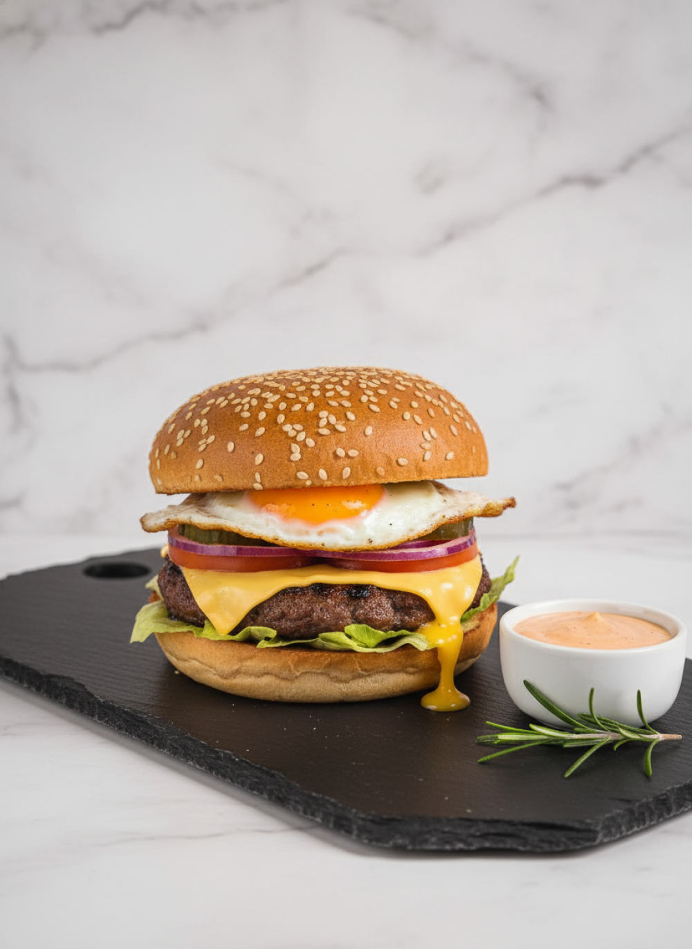 Булочка, фирменный соус, помидор, яйцо, котлета говяжья, сыр плавленый, салат.