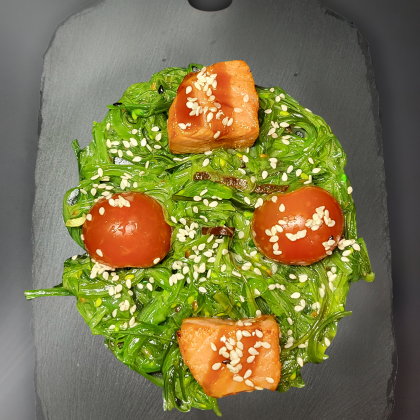 Салат (Пекинская капуста), ломтики свежих помидор, хрустящие сухари, креветка, твёрдый сыр, соус цезарь.